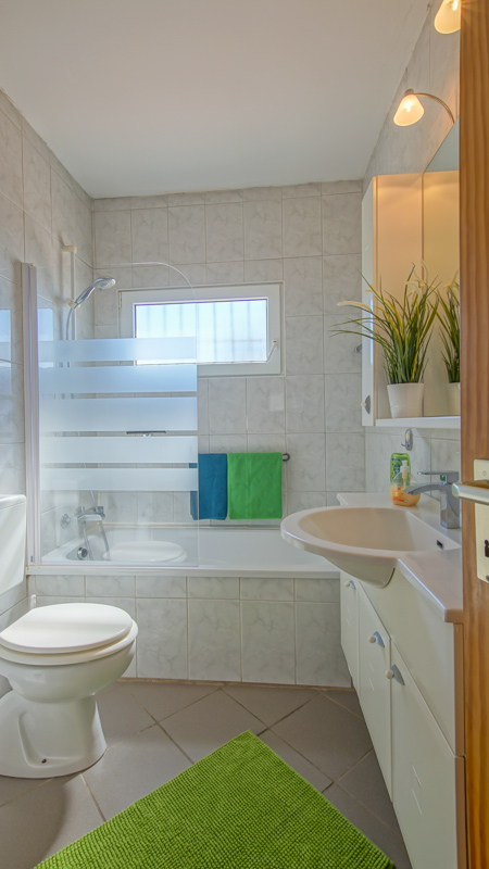 Auf der oberen Etage befindet sich noch das Tageslicht Badezimmer mit Dusche/Badewanne, WC und Waschbecken. Handtücher sind gegen eine kleine Gebühr für die Dauer des Aufenthaltes erhältlich.